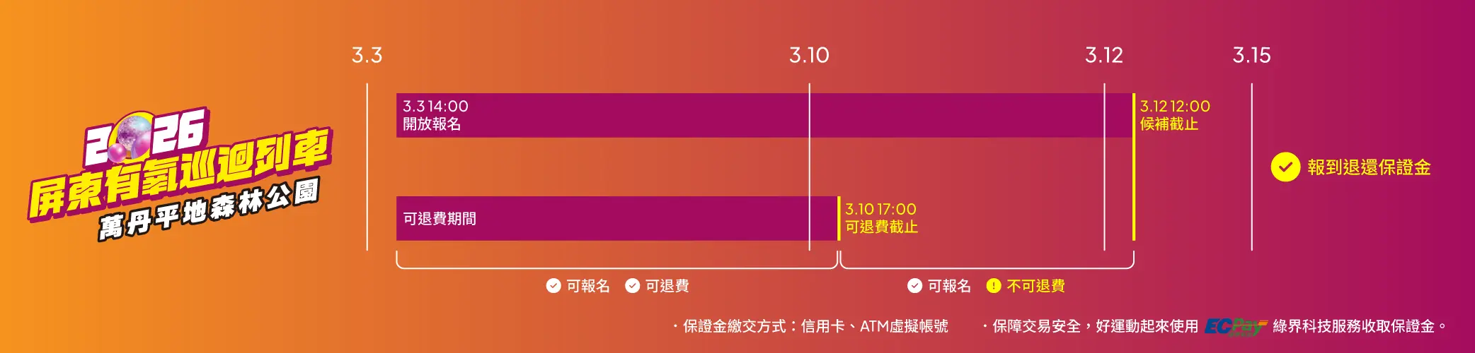 - 取消報名退款時,使用信用卡一次付清者,可全額退刷;使用ATM虛擬帳號轉帳者,請主動提供收取退款的帳號與銀行代碼,保證金將在扣除手續費後,於活動結束後退款至指定帳戶。